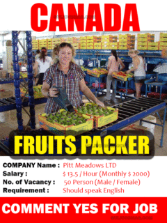 Fruits Packing Job in CANADA – Apply Now Posted on by admin Excellent Job opportunity for Canada !! No service charge required. 100% Free visa & Ticket !! Apply Now !!