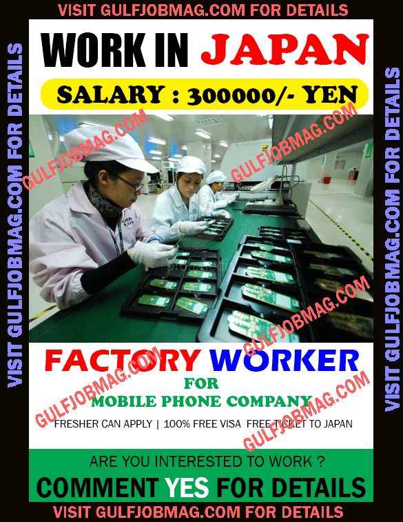 Factory worker wanted for mobile company in Japan Posted on by admin Factory worker Job in Japan – Apply Now !! No service charge required. 100% Free visa & Ticket !! Apply Now !!