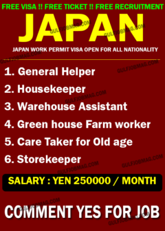 Multinational company hiring in Japan Posted on by admin Excellent Job opportunity for Japan !! No service charge required. 100% Free visa & Ticket !! Apply Now !!